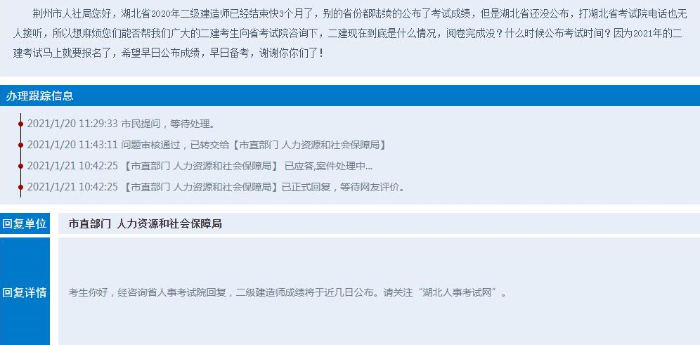 2020年湖北二建考试成绩什么时候公布?有心急的考生咨询湖北荆州市人社局,终于得到了官方回答:二级建造师成绩将于近几日公布。请关注“湖北人事考试网”。