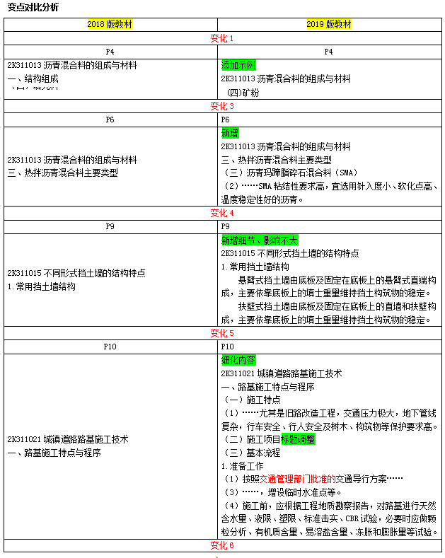 第一章城镇道路工程变动不大,第四节新增道路维护技术;第二章城市桥梁工程对基本概念进行了部分修正,增添了防水处理与支座、伸缩缝施工技术;第三章城市轨道交通工程(明挖基坑、喷锚暗挖等调整幅度较大,细化盾构施工细节)和第五章城市管道工程(细节数字变动多,新增聚乙烯燃气管道施工)内容变动较大,需要重点学习;