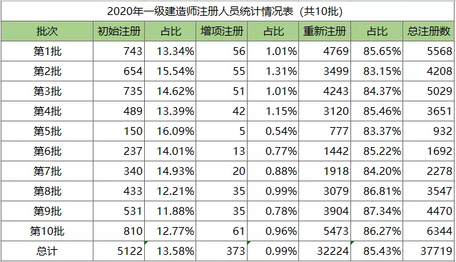 截止325日,住建部官网今年已经公布了10批一级建造师注册人员名单,共37719人,其中初始注册5122人,增项注册仅373人,重新注册高达32224人。各批次注册人数如下: