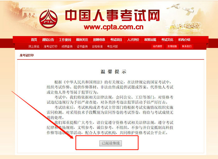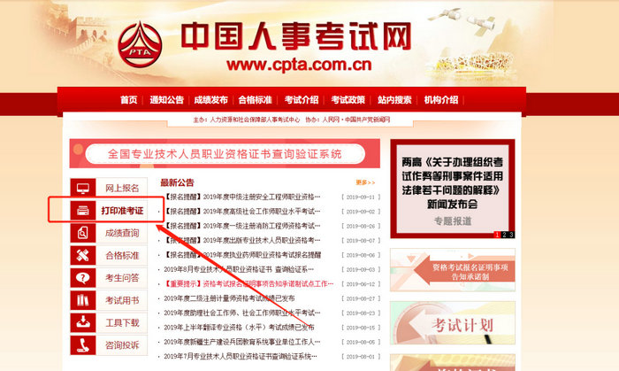 第一步:进入中国人 事考试网,找到【准考证打印】入口,点击进入