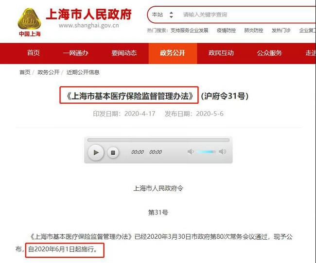 5月6日,上海市人民政府网站公开《上海市基本医疗保险监督管理办法》,且表示将在2020年6月1日起施行。