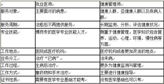 从执业医师与健康管理师的工作内容来分析,我们可以看出健康管理师与医生的主要工作目标都是为了健康行业在提供自己的医术支持。