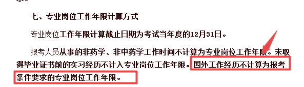 报考人员从事的非药学、非中药学工作时间不计算为专业岗位工作年限。未取得毕业证书前的实习经历不计入专业岗位工作年限。国外工作经历不计算为报考条件要求的专业岗位工作年限。