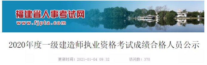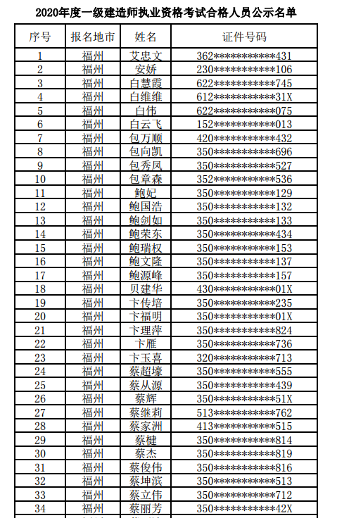 根据《司法部关于印发开展证明事项告知承诺制试点工作方案的通知》(司发通[2019]54号)、《人力资源社会保障部办公厅关于印发<人力资源社会保障系统开展证明事项告知承诺制试点工作实施方案>的通知》(人社厅发[2019]71号)及《人力资源社会保障部人事考试中心关于印发<专业技术人员资格考试报名证明事项告知承诺制试点工作实施方案)的通知》(人考中心函[2019]26号)的规定和要求,现将福建省2020年度一级建造师执业资格考试成绩合格人员予以公示,共6342人(名单附后)。