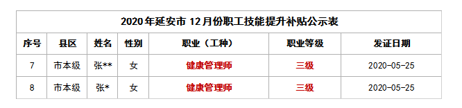 近日,陕西省延安市人社局发布了《关于延安市参保职工技能提升补贴人员的公示》,公示名单中包括取得健康管理师的相关人员,具体内容整理如下: