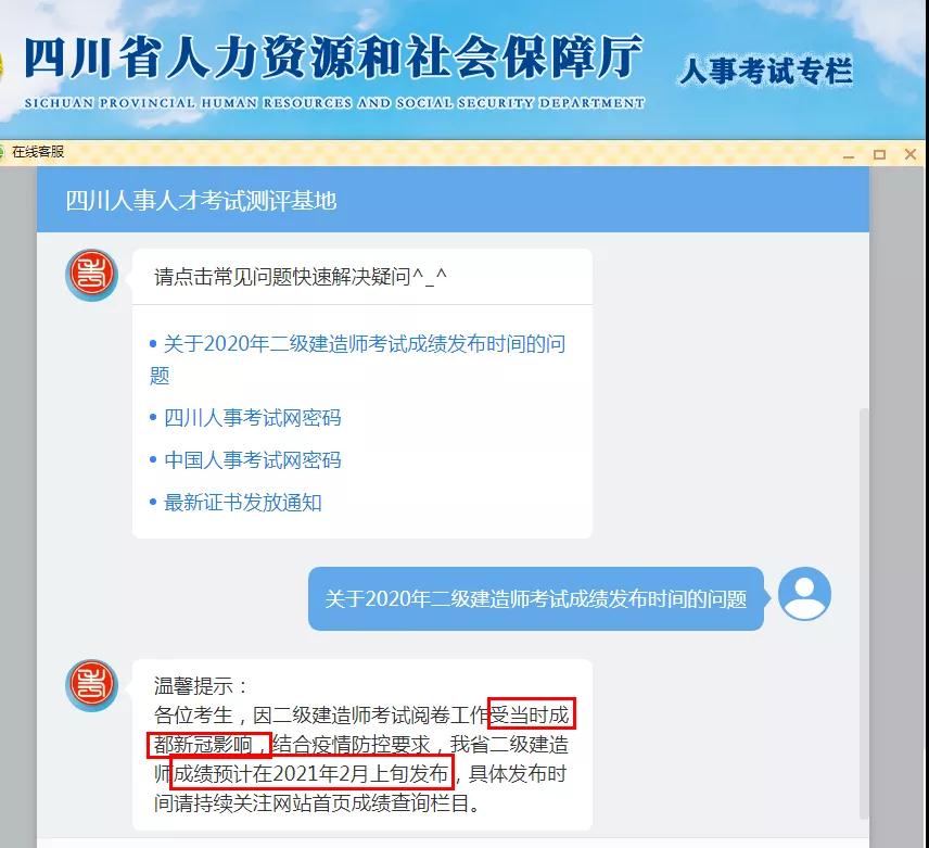 官方回复:四川二建考试阅卷受成都新冠影响,结合疫情防控要求,四川二建成绩预计2021年2月上旬发布。