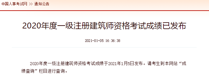 2020一级建筑师成绩查询时间:2021年1月5日开始