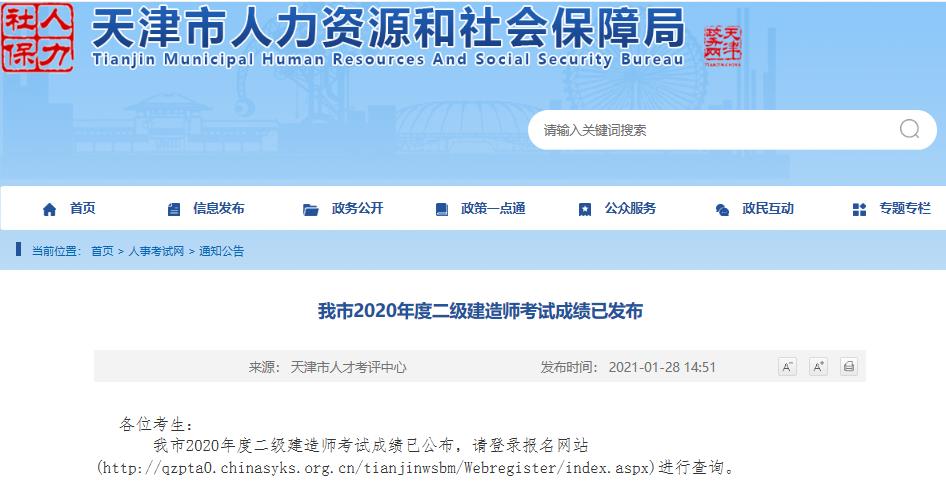 2020年1月28日天津人力资源和社会保障局官方发布了2020年天津二建 成绩公布的通知,天津的考生门及时登录官网查询成绩。