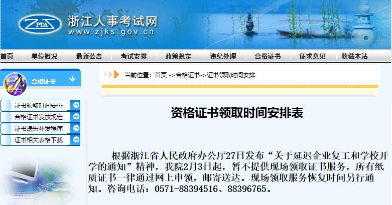 根据浙江省人民政府办公厅27日发布“关于延迟企业复工和学校开学的通知”精神,我院2月3日起,暂不提供现场领取证书服务,所有纸质证书一律通过网上申领,邮寄送达。现场领取服务恢复时间另行通知。咨询电话:0571-88394516、88396765。