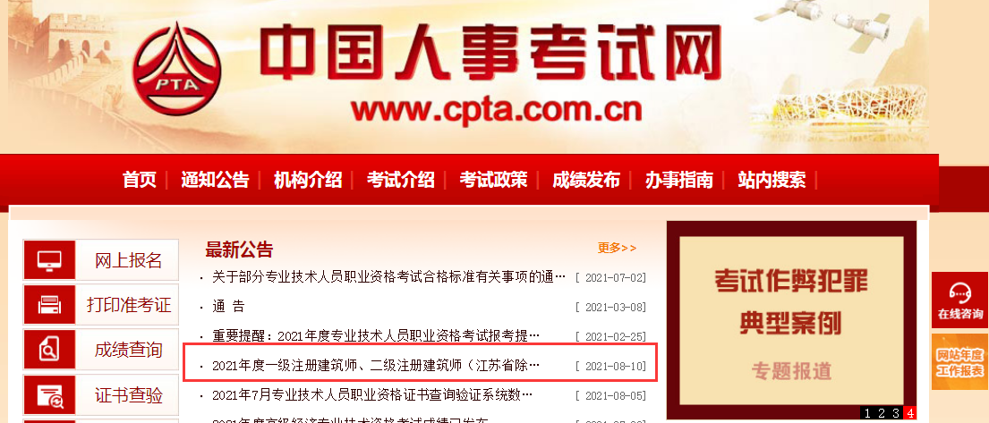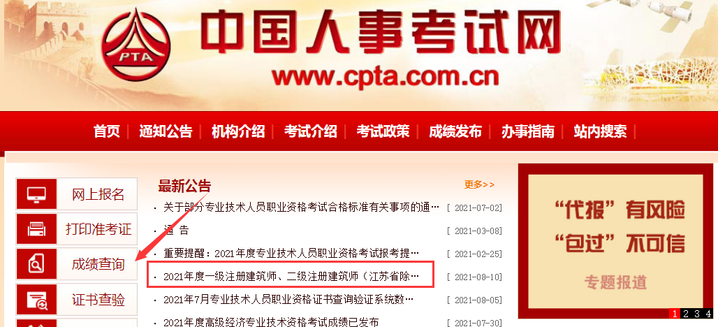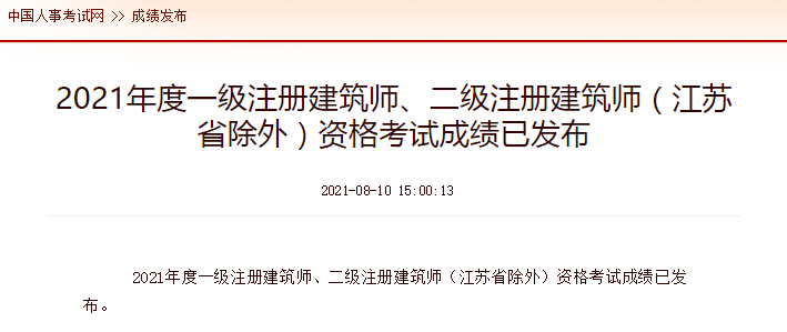 中国人事考试网2021年一级建筑师成绩查询时间8月10日起!请大家抓紧时间查询成绩!