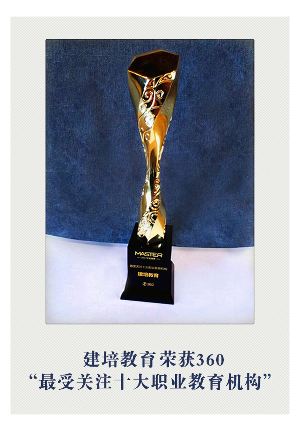 2017年12月,360举办的年度最受关注职业教育机构评选盛典上,建培教育以高评价、高服务、高口碑在众多知名教育机构中脱颖而出,荣获“2017年最受关注十大职业教育机构”奖。
